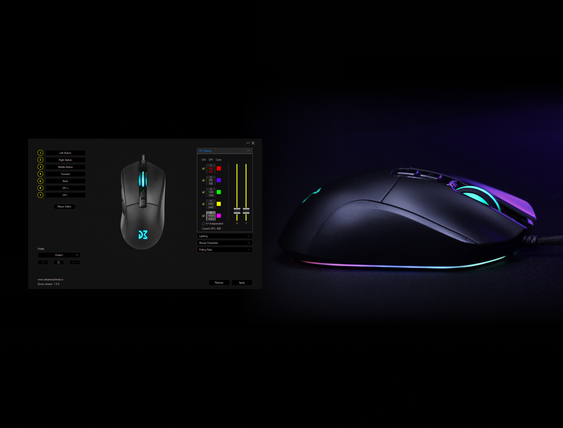 DM4 Evo posiada również dedykowane oprogramowanie, które pozwala na jeszcze więcej. Dzięki niemu możesz dowolnie skonfigurować swoją myszkę. Zmień swój polling rate, dostosuj DPI czy zmień sposób podświetlania. To i wiele więcej jest dostępne dzięki oprogramowaniu do myszki DM4 Evo!